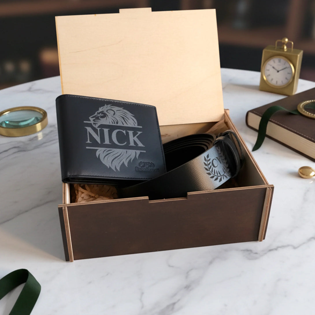 Premium Geschenkset aus schwarzem Leder für Ihn – personalisierte Geldbörse & Gürtel